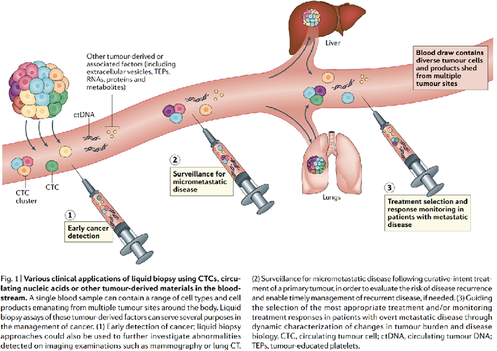 液體活檢通過取樣血液、尿液、腦脊液、胸水、腹水、唾液等對(duì)疾病進(jìn)行診斷,能在一定程度上避免組織異質(zhì)性對(duì)腫瘤分子分型的影響。目前,基于血液的液體活檢是最主要的研究方向,主要檢測(cè)血液中游離的循環(huán)腫瘤DNA(ctDNA)、循環(huán)腫瘤細(xì)胞(CTC)和外泌體(Exosomes)。相比于組織活檢,液體活檢技術(shù)主要具有無創(chuàng)、可重復(fù)性強(qiáng)、可實(shí)現(xiàn)早期診斷、進(jìn)行動(dòng)態(tài)監(jiān)測(cè)、克服腫瘤異質(zhì)性等優(yōu)勢(shì)。