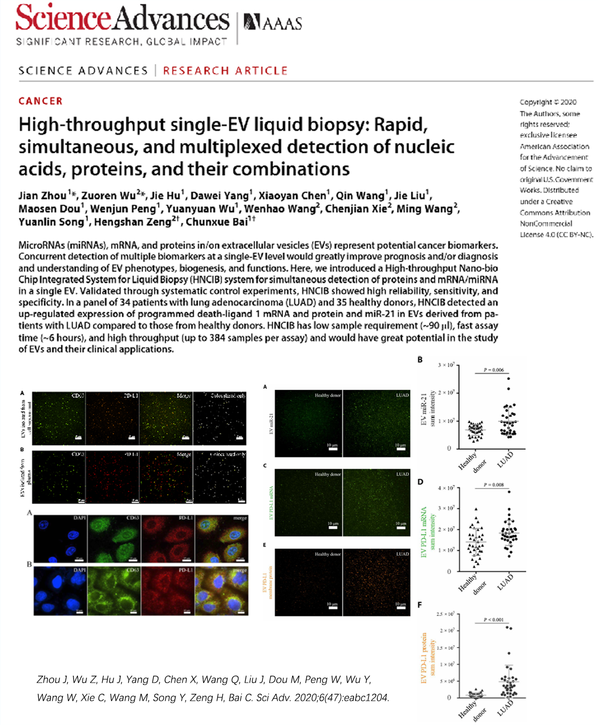 公司建成了 “Lab On Chip”,基于單個(gè)EV的高通量納米生物芯片的集成液體活檢系統(tǒng)(High-throughput Nano-bio Chip Integrated System for Liquid Biopsy, 簡稱HNCIB),可以同時(shí)檢測(cè)單個(gè)EV中的核酸和蛋白表達(dá),具有較高的信噪比、靈敏度和特異性。該系統(tǒng)主要包括:高通量的納米生物芯片制造、脂質(zhì)體納米顆粒合成、納米顆粒原位高效捕獲和富集EV、包被RNA探針、利用全內(nèi)反射熒光顯微鏡(Total Internal Reflection Fluorescence Microscope,簡稱TIRFM)實(shí)現(xiàn)單個(gè)EV中多個(gè)靶標(biāo)的高分辨率成像、深度學(xué)習(xí)算法和自動(dòng)化分析方法,實(shí)現(xiàn)快速和自動(dòng)圖像分析等。是一種快速、簡便的液體活檢方法,對(duì)疾病早期診斷和復(fù)發(fā)監(jiān)測(cè)的突破性技術(shù)。