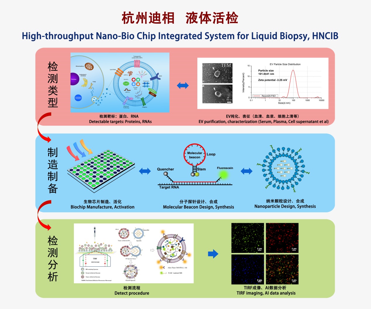 公司建成了 “Lab On Chip”,基于單個(gè)EV的高通量納米生物芯片的集成液體活檢系統(tǒng)(High-throughput Nano-bio Chip Integrated System for Liquid Biopsy, 簡稱HNCIB),可以同時(shí)檢測(cè)單個(gè)EV中的核酸和蛋白表達(dá),具有較高的信噪比、靈敏度和特異性。該系統(tǒng)主要包括:高通量的納米生物芯片制造、脂質(zhì)體納米顆粒合成、納米顆粒原位高效捕獲和富集EV、包被RNA探針、利用全內(nèi)反射熒光顯微鏡(Total Internal Reflection Fluorescence Microscope,簡稱TIRFM)實(shí)現(xiàn)單個(gè)EV中多個(gè)靶標(biāo)的高分辨率成像、深度學(xué)習(xí)算法和自動(dòng)化分析方法,實(shí)現(xiàn)快速和自動(dòng)圖像分析等。是一種快速、簡便的液體活檢方法,對(duì)疾病早期診斷和復(fù)發(fā)監(jiān)測(cè)的突破性技術(shù)。